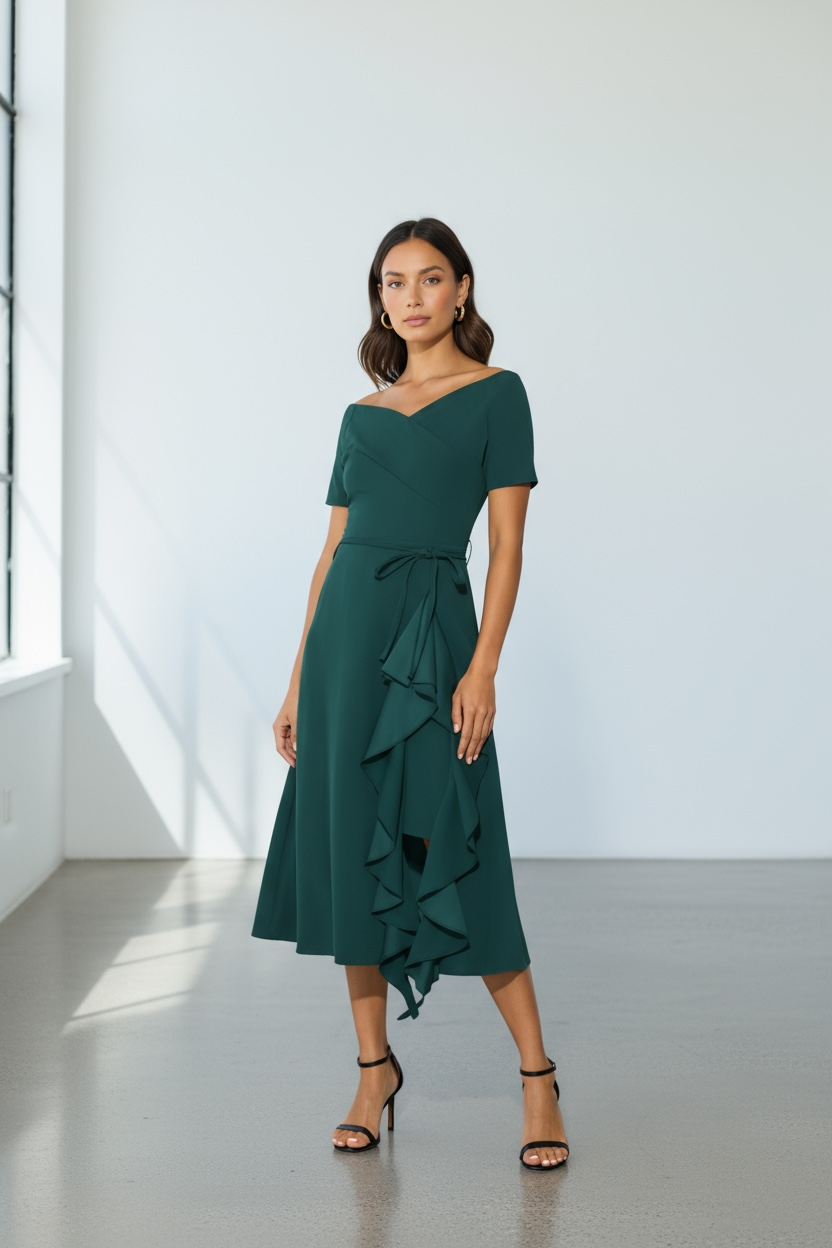 Experience elegance and style with our Bardot Frill Midi Dress. This timeless piece features delicate frill detailing and a flattering tie belt that accentuates your waist. The midi length adds a touch of sophistication, making it perfect for any occasion. Elevate your wardrobe with this stunning dark green dress.